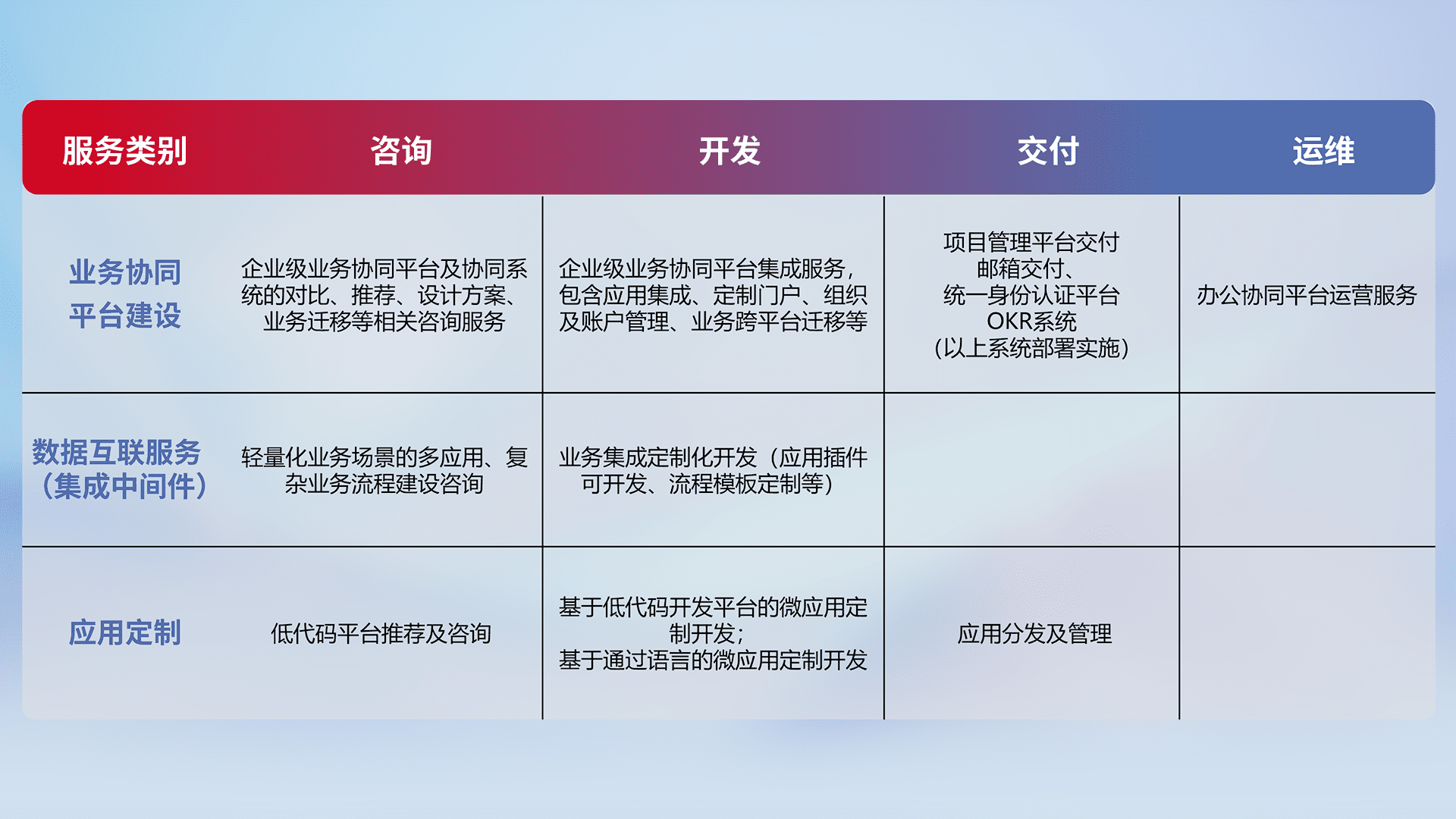 针对钉钉、、、、企微、、、、IDaas等平台级产品提供产品的规划、、方案、、、、交付、、、、定制化开发等服务,,,,实现如统一协同办公、、智能客户服务、、、、混合会议管理、、、、智能数据查询、、、等业务场景,,实现数字化转型。。