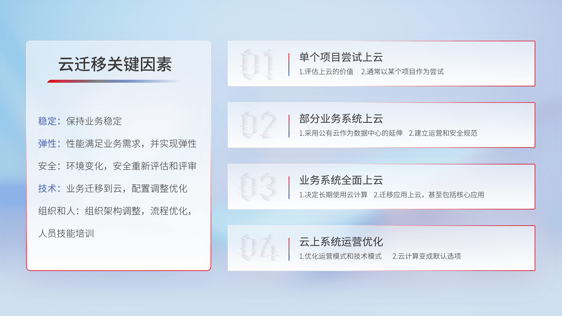 结合实际业务,,从规划设计、、云平台选型、、、云原生改造、、、、数据迁移、、、集成交付,,迁移全过程为客户识别最佳上云路径,,,做好风险识别管理,,,设计网络架构、、、、身份权限、、、、安全审计合规、、、操作审计、、、日志审计、、、、监控告警策略、、多站点容灾设计等,,对云上基础设施进行整体规划,,,提升IT治理水平,,,,以满足弹性、、、、高可用、、高性能的需求。。。