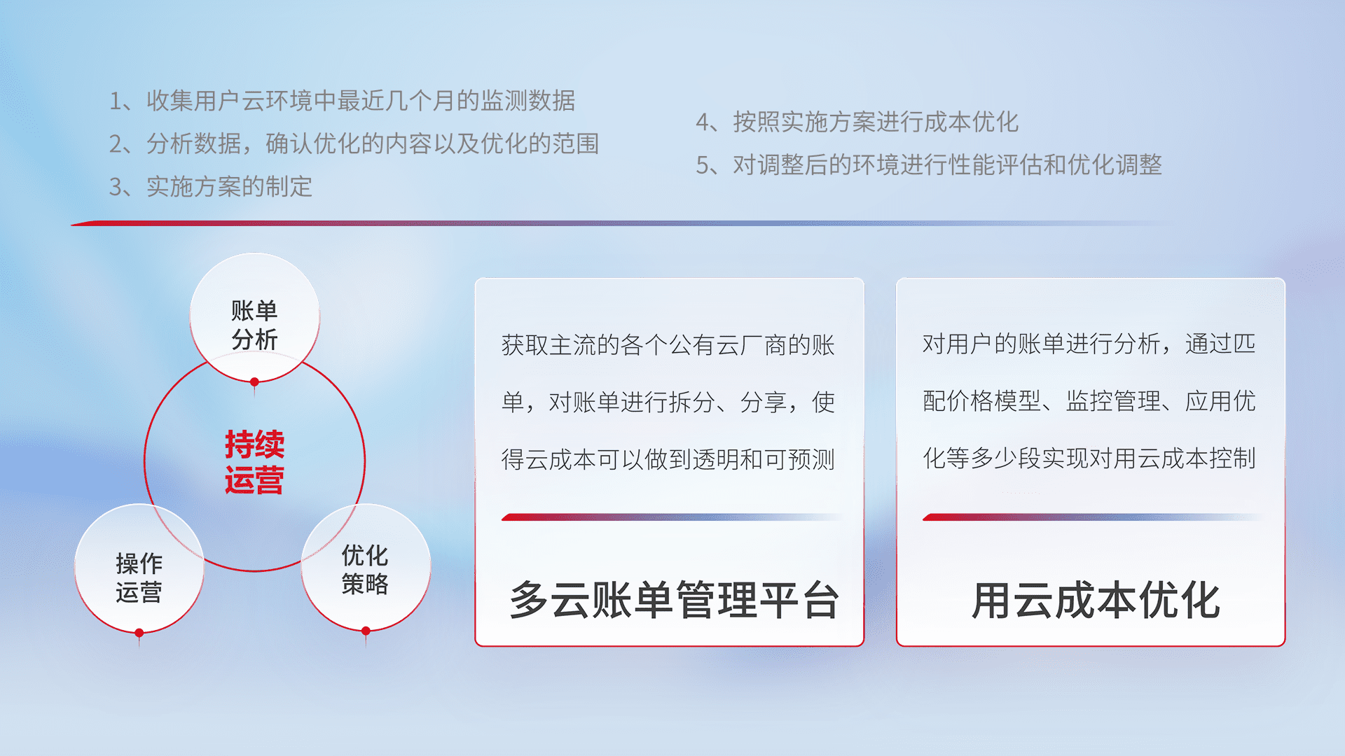 通过多云纳管,,,以统一的资源数据模型把客户的云资源进行抽象和封装,,进而实现对多云资源的统一操作,,,,保障云资源管理的可靠性、、、稳定性与可用性。。。。量身定制化运维内容,,配置、、开发运维、、、补丁管理、、备份、、、、监控、、认证和访问管理、、审计和日常巡检等,,,,保障在用云过程中的可靠度,,,稳定度以及高可用率。。。。